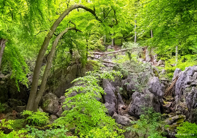 Eine Laune der Natur? Auch das, ja. Das von Moosen und Flechten überzogene Waldstück mit seinen wild durcheinander gewürfelten Felsen – auch Kegelkarstlandschaft genannt – ist wie ein kostbares Fenster in die ferne Tertiär-Zeit. Aber zusätzlich wimmelt es hier von Schächten und Stollen, die Generationen von Erzschürfern tief in die Erde trieben – zu einer Zeit, als im Ruhrgebiet noch Kühe weideten …