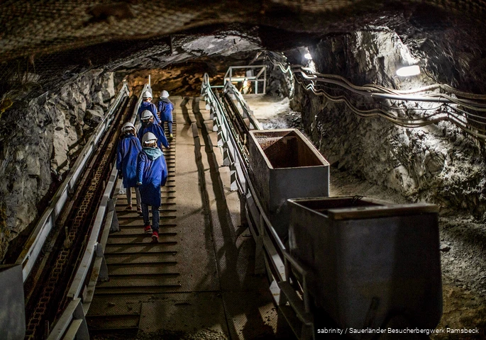 Über Tage: idyllische Hügel. Unter Tage: eine Zeitreise durch rund 1.000 Jahre Bergbaugeschichte an Bord einer Grubenbahn der 1950er Jahre. Mitte des 19. Jahrhunderts arbeiten hier über 2.000 Bergleute – Zugezogene aus Sachsen und dem Harz, die im Ramsbecker Revier ihr Glück suchen. Erzabbau und Verhüttung im großen Stil verwandeln den Ort für wenige Jahre in eine Art Ruhrgebiet im Hochsauerland …