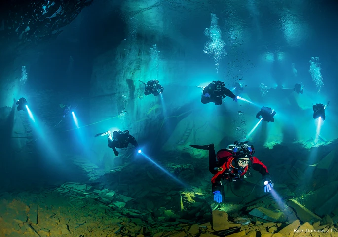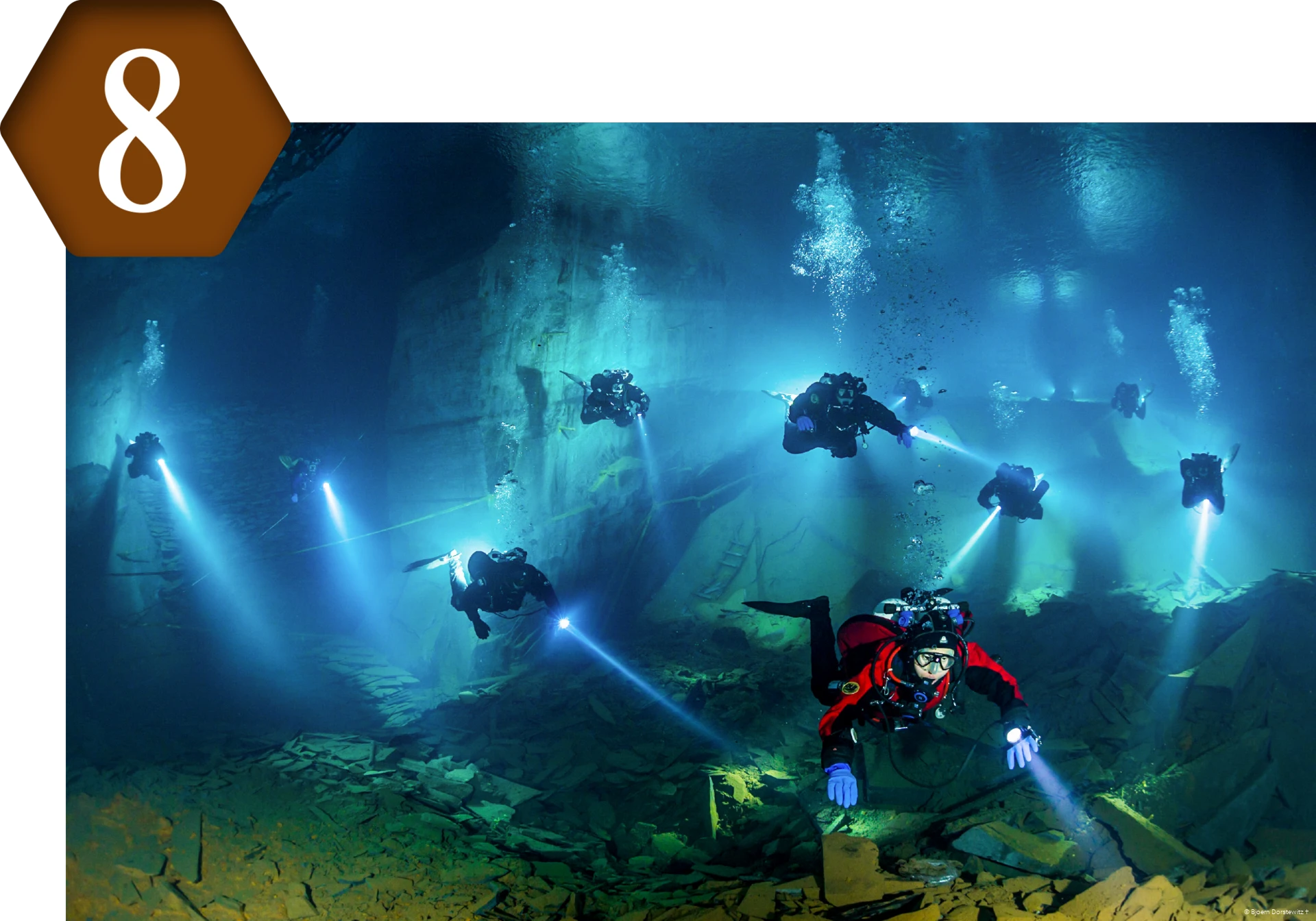 Die zweite Sequenz zeigt erfahrene Höhlentaucher bei einem Tauchgang im heutzutage gefluteten Teil des Schieferbergwerks in Nuttlar.