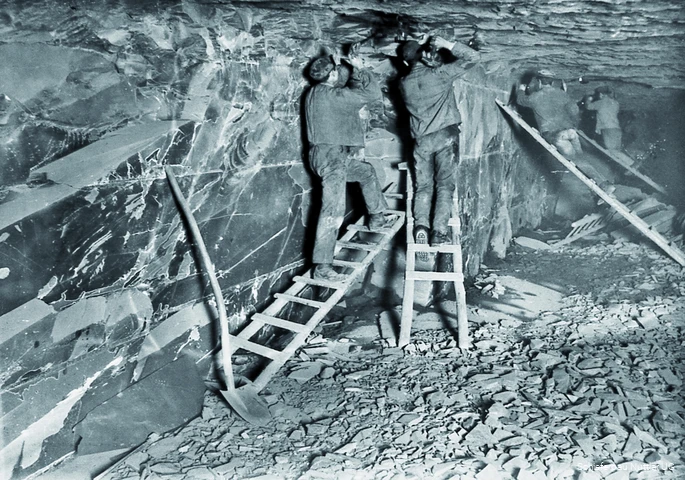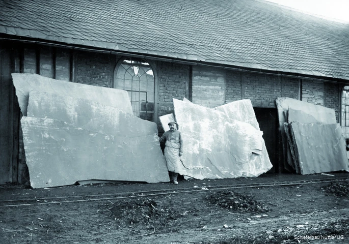 Im ersten Teil ist die Gewinnung und Verarbeitung von Dach- und Plattenschiefer zu sehen. Auf Loren werden die Schieferplatten aus dem Berg gefahren und auf dem Außengelände gestapelt.