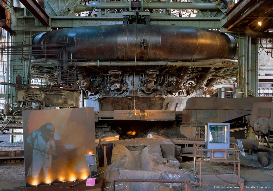 Die Abstichhalle, in der früher das 1.400 Grad heiße Eisen „abgestochen“ wurde, ist das Herz der Hochofenanlage. An vielen Stellen begegnet man auf Fotos, in Filmen und Interviews Menschen, die hier gearbeitet haben.