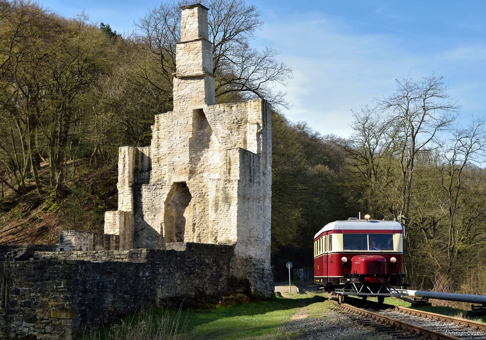 Historischer Triebwagen des Eisenbahnmuseums Bochum an der Burgruine Hardenstein in Witten.