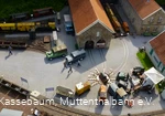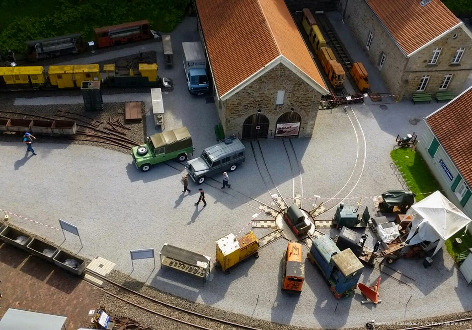 Zu sehen sind einige historische Gebäude der Zeche Theresia: links der vom Unwetter im Juli 2021 schwer beschädigte Lokschuppen, rechts das Café Theresia und rechts unten das „Dienstgebäude“ des Vereins Muttenthalbahn e.V.