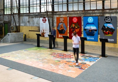 The thematic areas and info about the creators and makers of the steel time journeys can be found on large boards on the wall of the blower hall. On the floor you have the map and the monitors invite you to delve deeper.