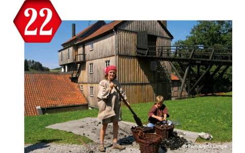 Woods and meadows everywhere. Plus timber-framed buildings and a mill's pond. Idyllic! And inside the Luisenhütte? Visitors find themselves facing ten metre charcoal blast furnace built in 1758, and see "molten iron" flowing from the tapping – as a light staging imitation of light. And they find out: This ironworks – the oldest fully preserved in Germany – was once the blueprint for the early Ruhr ironworks …