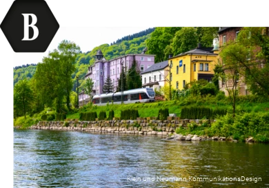 The amount of traffic on the Ruhr River Line is less significant. A particular success comes with the middle section between Düsseldorf and Hagen, opened in 1874: from the very beginning it substitutes the freight transport on the Ruhr in such a profound way that the boat services, which had been flourishing until then, collapse immediately. The "Obere Ruhrtalbahn" ("Upper Ruhr River Line") is designed primarily as a long-distance route from Hagen towards Kassel, but in the Neheim-Hüsten area it also provides momentum for local lime and steel industries. The construction of the German Wall makes it unattractive as a west-east axis. Recently, it has gained significance again – as a connection between the Ruhr area and the winter sports resorts of Winterberg and Willingen.