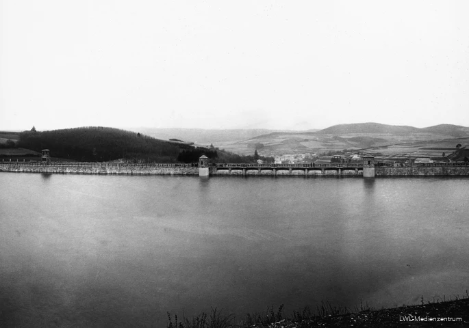 The second dam crest, to be precise. The first dam, completed in 1905, used to run about 200 metres below the present one. However, the porous limestone bedrock, perforated like a Swiss cheese by the carbonated water of the Henne River, causes problems. As a result, so much water is lost that the operation of the first dam is no longer worthwhile and, on top of that, there is a risk of damages to the dam itself. So the water of Lake Henne I is allowed to run off like from a bathtub, but a new reservoir is urgently needed to compensate for low water in the Ruhr and to ensure the water supply of the Ruhr District. Today's barrage is located at a site where the perforated bedrock is cheaper to seal. It enters service in 1955 and, with 38.4 million cubic metres of water, is one of the smaller reservoirs in the Ruhr river basin. The region's combined reservoir capacity is 473 million litres, with Bigge and Möhne lakes accounting for the lion's share (60 percent). This enormous water reserve is an integrated system that is controlled by the Ruhr Association's Reservoir Control Centre in Essen.