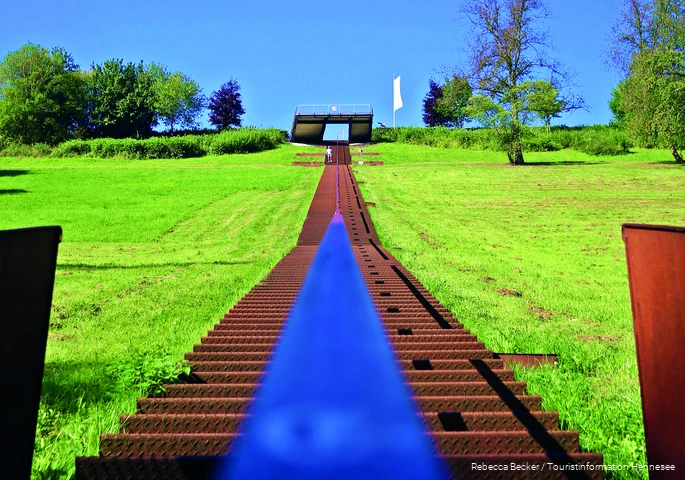 Beyond that, the artificial lakes provide South Westphalia with a tourist trademark that is further enhanced by specific projects. In the case of Lake Henne, this includes the renaturation of the river Henne as well as the landscaped Henne Boulevard, which connects the dam with the town centre of Meschede, two kilometres away. A striking highlight is the illuninated "Stairway to Heaven", which leads to a 60-metre-high panoramic platform.