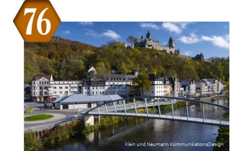 De Kahle Asten is het hoogtepunt van onze reis, Alfred. Van hieruit kunt u bij helder weer helemaal tot aan het Ruhrgebied kijken! Dan in een wervelwind naar beneden naar Olsberg, langs de legendarische Bruchhauser Steinen. Over stenen gesproken: erts en leisteen worden in dit gebied gedolven - en kerstbomen gedijen prachtig op de heuvels. Wat dacht je van een dennenboom voor je villa op een heuvel? Tenslotte brengt de etappe ons naar Arnsberg met zijn oude klooster, romantische kasteelruïnes en herbergen die goed zijn uitgerust om de hongerklop te stillen.