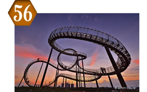 De waanzinnige hitte – 1.500 graden bij het aftappen van de hoogoven – is vervlogen, maar de rest van de voormalige Thyssen-ijzerfabriek staat er nog, alleen anders: de gasometer is nu een duikbad, de ertsbunker een klimtuin, en vanuit hoogoven 5 kijken bezoekers uit over het westelijke Ruhrgebied. Het is moeilijk te geloven dat hier ooit op grote schaal ertsen uit de hele wereld, deels ook uit het Siegerland, werden gesmolten …