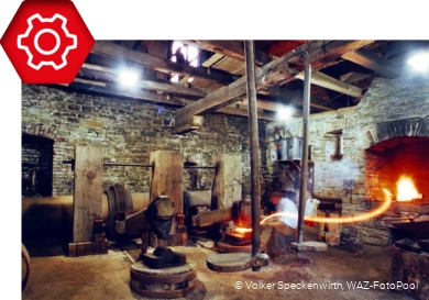 Geen aandrijving zonder water! Dit geldt ook voor de pre- en vroeg-industriële technologie in het Sauerland. Of het nu gaat om een graanmolen of een vollersmolen, een slijperij of een draadtrekkerij, een smelterij of een hamermolen – de locatie is altijd dezelfde: in het dal, aan het water! Ook in het openluchtmuseum in Mäckingerbachtal draaien de waterraderen. Zo ziet mechanisch werk eruit voordat de Ruhrsteenkool de waterkracht verdringt …